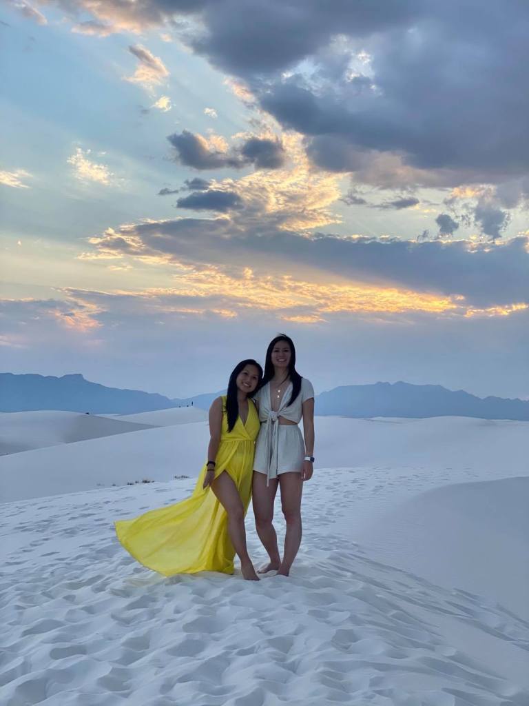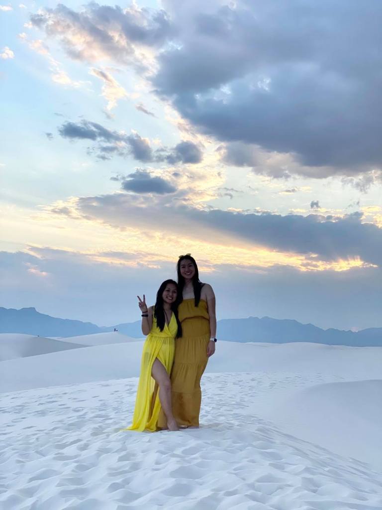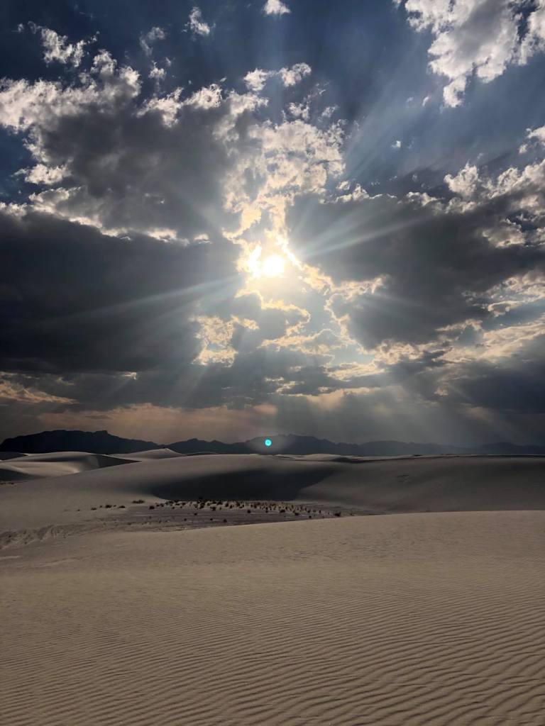 After brunch, we walked around Old Town Albuquerque for a little bit to souvenir shop and grabbed a sandwich (for our dinner) at White Sands National Park (WSNP). About an hour before you arrive at WSNP, I would highly recommend getting gas because there are about 100+ miles of just nothing until you reach the small town of Alamogordo. We stopped at the WSNP Visitor’s Center to use the restroom and souvenir shop since it closes at 6pm. They sell sleds there to slide down the White Sands for $20. After that, we drove all the way to the end of White Sands (there is a dead-end loop there), parked the car, and enjoyed the magical place. The sand was WHITE and so soft. Luckily, it wasn’t too hot, and there were some clouds with amazing rays. The pictures don’t do it justice. It was truly an incredible place; it felt like heaven! We stayed for sunset, and at 9pm, it got windy!