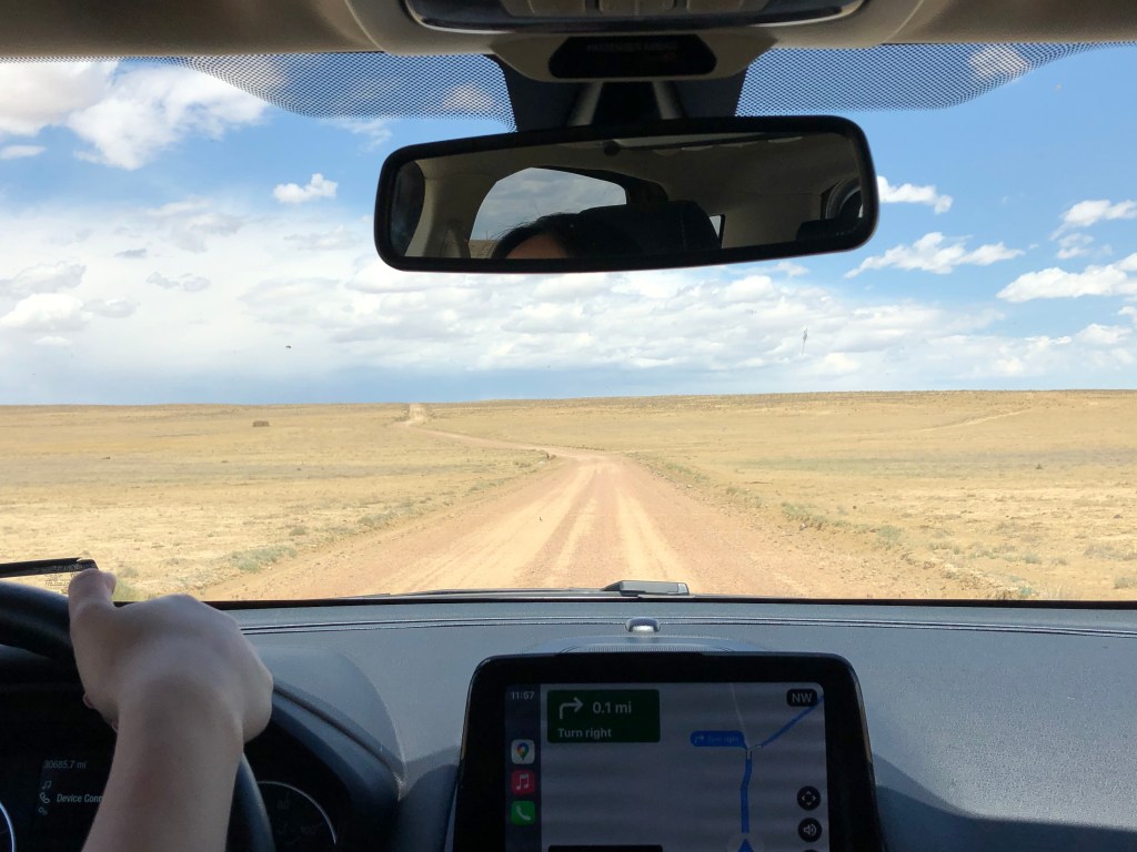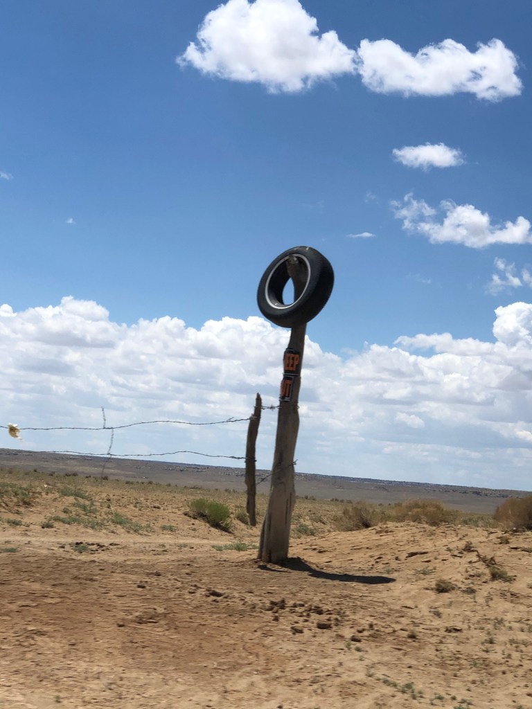 We drove to Ah Shi Sle Pah Wilderness which is near Bisti Badlands. It was about a 2.5-3 hour drive from downtown Albuquerque, and for the most part, the roads were paved. In the last 30-45 minutes, the road is on gravel, and there were a few houses, random signs, objects such as tires, etc., on the side. It’s in the complete desert; there are no restrooms and barely any civilization. My friends and I took pictures and noted down what we saw to remember it on our way back out. Luckily, the car’s GPS was strong enough, and we had wifi out there – surprisingly! I was pretty nervous about losing signal and being out in the heat. Here are some photos of the road…