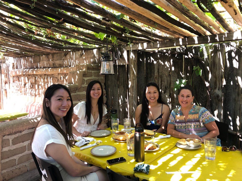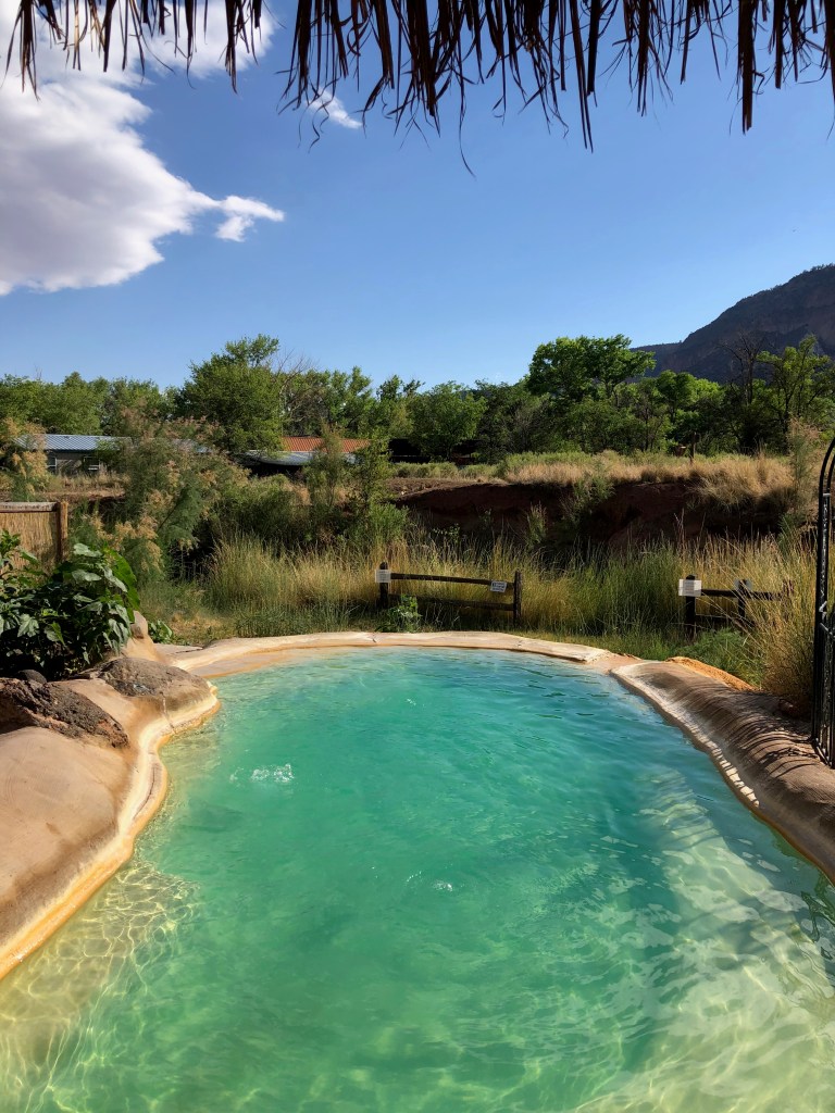 After this, we drove to Jemez Hot Springs. It was about another 2-hour drive, and we were happy to be back on a paved road, and it was sunny again! The fee was $25 for an hour, and it was such a cute, relaxing, and quiet location. They have changing rooms, clean restrooms, outdoor showers (with wooden doors for privacy), and lounge chairs. This location is first come, first serve because there are only 4 hot spring pools, and it’s shared with everyone, so if you want a “private” pool to yourself, come on a weekday or off time. We explored all 4 pools and had 1 to ourselves for a few minutes – and this was a Friday afternoon.
