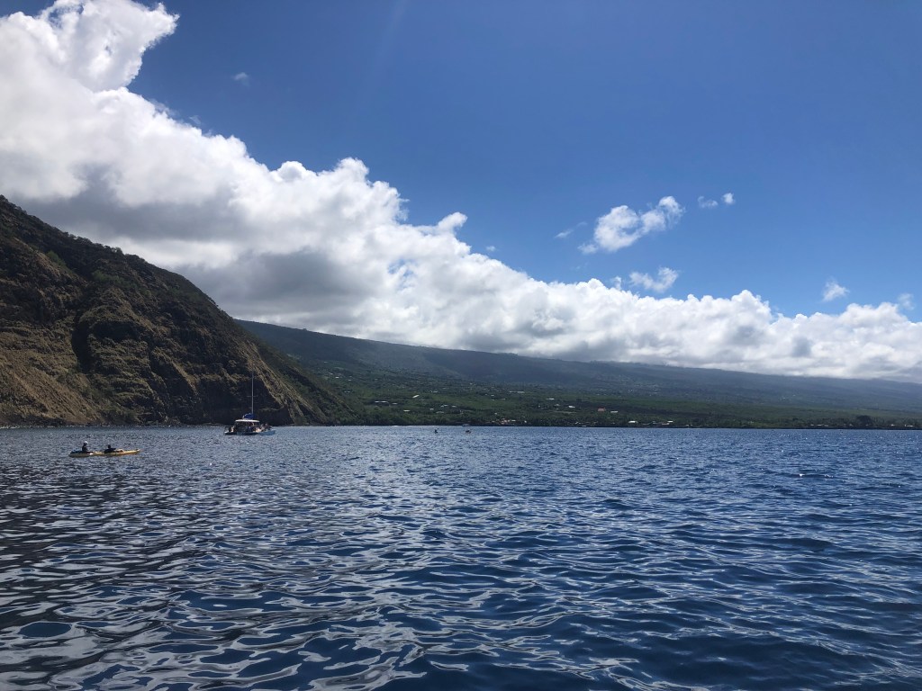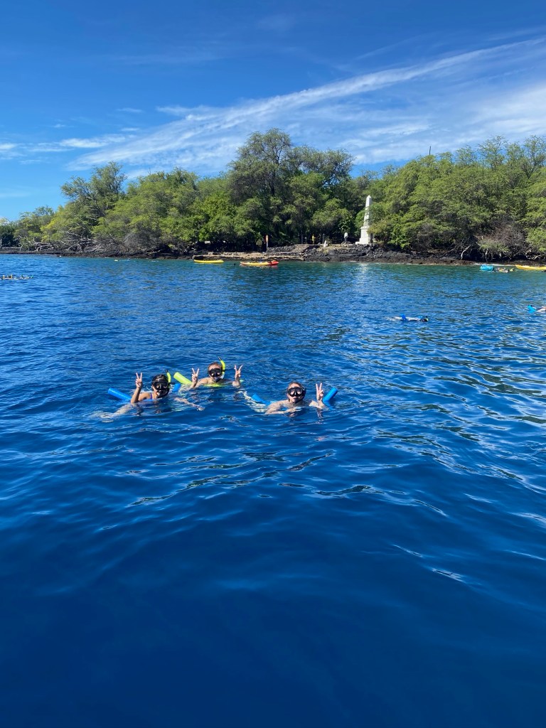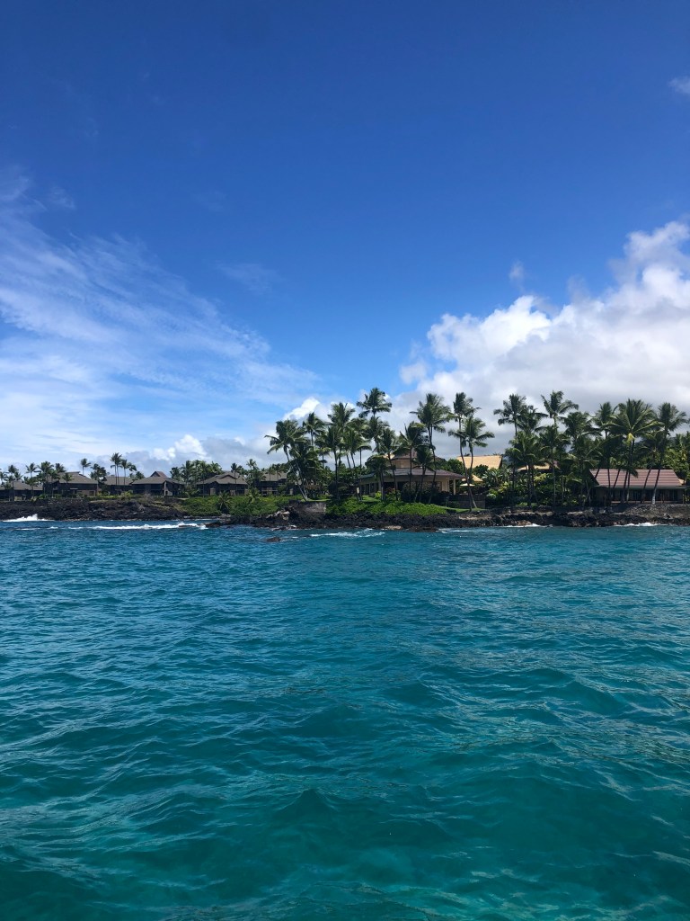 We booked the snorkeling tour through Hang Loose Boat Tour! The time was scheduled from 8am-12:30pm, but it was actually 8:30am-12:00pm. We arrived at 7:50am and did not get onto the boat until 8:30am or so. They checked us in, gave us snorkeling gear, and the boat ride was about 15 minutes to the Kealakekua Bay. The boat ride was breathtaking! It was so sunny, and the water was pure blue and so clear. It was beautiful. Once we got to the Kealakekua Bay, we saw Captain Cook’s statue, and the tour guide, Adam, gave us instructions, and we were off! They had pool noodles, and we used those and WOW…I wish I owned a GoPro – the coral reefs and fishes were soooo pretty! We saw Yellow Tangs, Moorish Idol Fish, Fairwind White Spotted Puffer Fish, sea urchins, and many more fishes that I do not even know the names of! Adam told us that there are more than 50 types of fish here. We swam, enjoyed the water, and then hopped on the boat to get a photo. Then, Adam joined us to jump off the boat together! It was super fun! It was a great experience. They provided lunch and snacks for us. I was also happy with the group of people we had on our boat. Super chill! I wish it were longer because we had a good time swimming and jumping around. Then, on the ride back, we stopped at 3 locations: an inspired Moana rock statue, saw one of Oprah’s beach houses, and the snorkeling area with the Manta Rays.