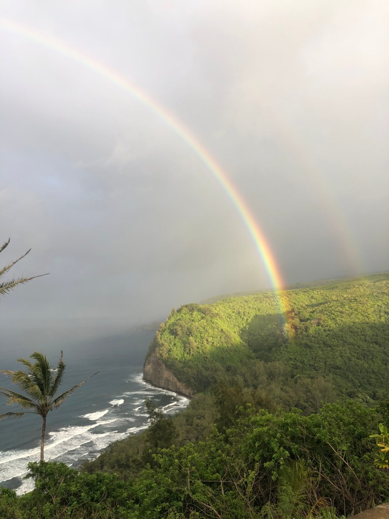 It is a very quick stop! You just park in the parking lot for free, walk out for 30 seconds, and you will see the waterfall! It is good if you do not want to hike to see a waterfall and want something quick. Unfortunately, we did not see a rainbow when we were there, but we went to Pololu Valley Lookout afterward, and boom! We saw the double rainbow as shown above 🙂 I guess Pololu Valley Lookout was looking out for us, haha!