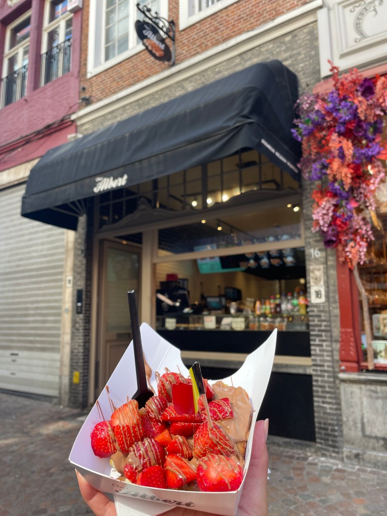 There are two Chez Albert waffle places in Bruges, but I got the one on Gauffres street since it was not crowded. I got the chocolate covered strawberry waffle…and wow, it was COVERED in chocolate that I couldn’t even see the waffle LOL. The chocolate was just perfect – not too sweet. The strawberries were so fresh. The waffle was warm and soft and not too sweet either since I don’t really like sweets. Wow, just blogging about this makes me drool.
